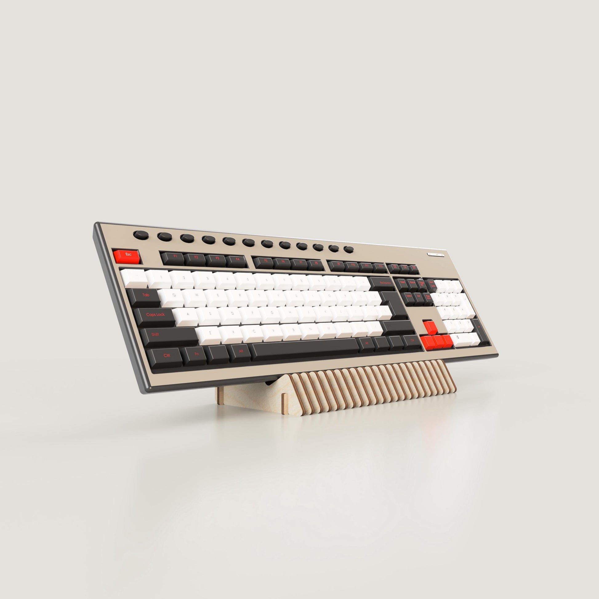 Our keyboard stand, a futuristic wooden gaming accessory designed to display and elevate your keyboard on the desk